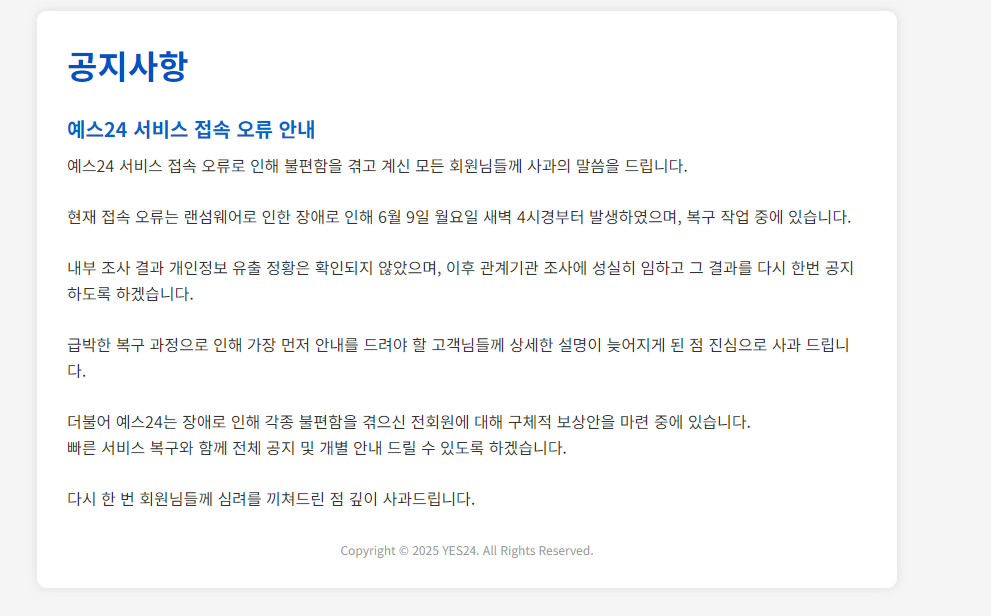 하지만 국회 최수진 의원실이 한국인터넷진흥원(KISA)에 확인한 결과, 예스24는 어제 새벽 해킹 피해를 당했고, 오후에는 피해 신고까지 했다는 사실이 드러났습니다. 즉, 단순 시스템 점검이 아니라 랜섬웨어 침투로 인해 회원 데이터가 암호화되었고, 예스24는 이를 풀지 못하고 있는 상황이었던 것이죠.